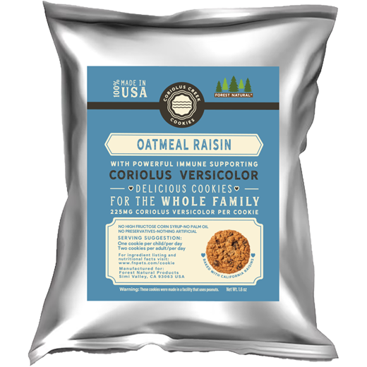 Coriolus Creek Cookies are a daily dietary supplement for the whole family made with the coriolus versicolor mushroom to help support the body's immune system. These cookies are all-natural and free of hydrogenated oils, trans fats, high-fructose corn syrup, palm oil, preservatives and contain no artificial ingredients. They are lower in sugar than most cookies because they don't require over saturated sweetness to mask lower quality ingredients. They also include a proprietary strain of the coriolus versicolor mushroom and offer the best value for the money. It is a combination of both Polysaccharide Krestin (PSK) and Polysaccharide Peptide (PSP). The Coriolus versicolor mushroom offers much needed immune support and it can be taken on a daily basis.
